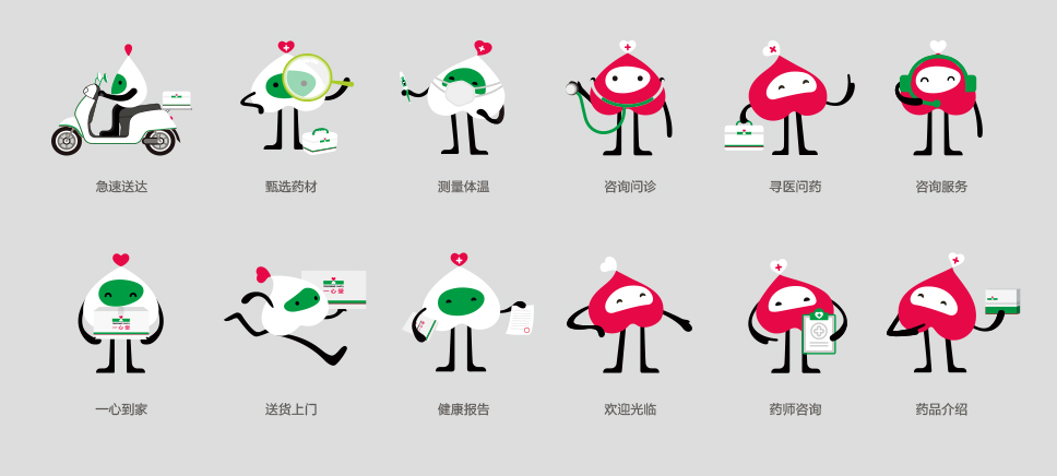 將取自標(biāo)志中的紅心和白心共同作為品牌價(jià)值擬人化的載體,嫁接標(biāo)志中所體現(xiàn)的一心堂的文化與價(jià)值觀 ,共同承載著心文化。靈活的的身份轉(zhuǎn)變,也可以在線(xiàn)下進(jìn)行用戶(hù)互動(dòng),輕松參與到各類(lèi)營(yíng)銷(xiāo)活動(dòng)中。