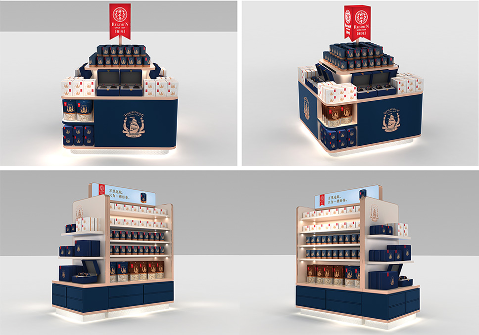 李華清以突出的文化視覺語言表現(xiàn)為同仁堂養(yǎng)生專柜終端賦能。以產(chǎn)品文化基因,”皇后號帆船“外部形態(tài)為設(shè)計(jì)靈感,沿用品牌標(biāo)識的色彩定位,體現(xiàn)皇后號滿載道地優(yōu)質(zhì)西洋參萬里遠(yuǎn)航而來的視覺形象。配合燈光系統(tǒng)、配色方案、材料運(yùn)用、產(chǎn)品產(chǎn)列等方面內(nèi)容,使西洋參市場終端營銷型展臺能在線下銷售端達(dá)到終端聚焦戰(zhàn)略效果,塑造出強(qiáng)大的形象識別力,建立起品類的絕對區(qū)隔與識別。