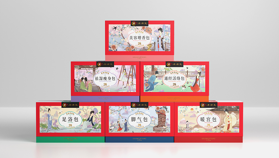 戰略色彩配置:唐代服飾華貴典雅,色彩明快鮮艷,花紋細膩繁復,喜愛采用明艷的對比色進行搭配體現了唐代包容開放的時代特征。借鑒唐代服飾配色之美,融合產品功效屬性進行色彩配置,顛覆人們對于傳統藥浴包的固有老舊傳統的印象和認知。